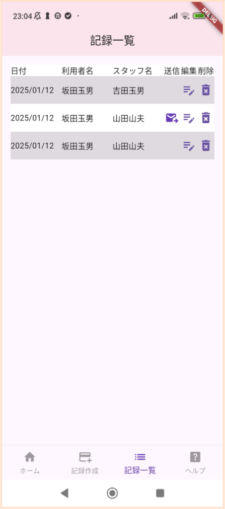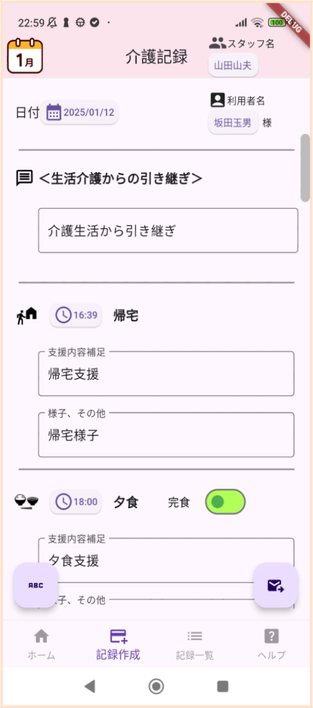 ホームヘルパー活動記録簿 2026.02.12 2025年6月リリース 介護の現場で必要な日々の活動記録をスマホやタブレットから容易に入力し、介護施設のサービス実施記録簿作成を支援するアプリケーションです。 ヘルパーさんが入力した記録はメールやWebデータベースに送信され、介護施設で一括して管理や出力ができます。 ホーム画面 記録入力画面 記録一覧 ご質問等はこちらまでご連絡ください。